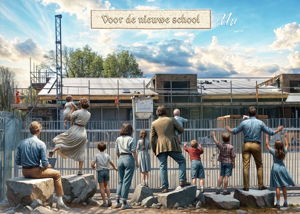 Mijn vrouw en ik staan met ons dochtertje Inge, voor het grote hek dat al maanden om de bouwplaats staat. Straks gaat Inge hier naar school. Elke week lopen we er even langs en dan zeggen we tegen Inge: “Kijk, dat is jouw nieuwe school. Mamma heeft daar ook op gezeten.” Vandaag wappert de vlag op het hoogste punt. Het schiet al op! Onze Bart heeft ook nog op ‘Op ’t Hof’ gezeten, maar die is nu klaar. Hij fietst nu elke dag naar Culemborg voor het middelbaar.