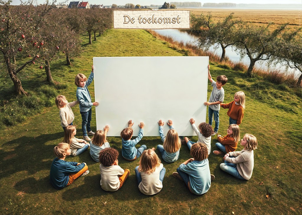 Ik ben benieuwd. Je kent mij niet want ik ben er nog niet. Ik heb ook nog geen naam. Ik ben, als het lukt met een vader en een moeder, een van de kinderen van de kinderen van jullie kinderen, een kind van straks. Ik kijk vanuit de verre toekomst even stiekem over de rand van dit bord mee naar wat jullie doen. Hoe jullie nu met elkaar en met de wereld omgaan. Of én hoe jullie ervoor gaan zorgen dat wij straks ook nog op die wereld kunnen leven.